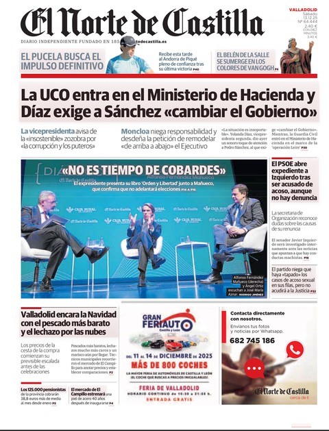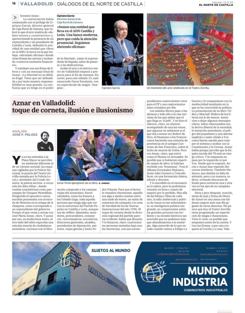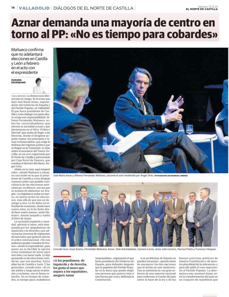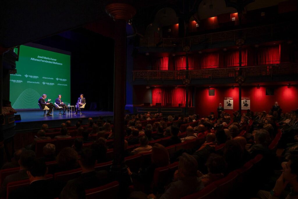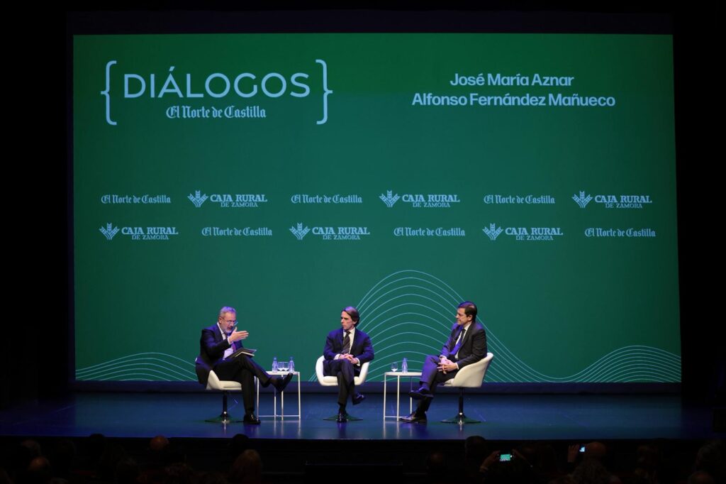 El expresidente del Gobierno y presidente de la Fundación FAES, José María Aznar, ha advertido de que “la democracia liberal está en riesgo” y ha llamado a construir “una mayoría nacional suficiente en torno al Partido Popular” para afrontar las próximas citas electorales. Lo ha hecho durante la presentación de su libro Orden y Libertad, en un diálogo con el presidente de la Junta de Castilla y León, Alfonso Fernández Mañueco, celebrado en el Teatro Zorrilla de Valladolid, en un acto organizado por El Norte de Castilla.