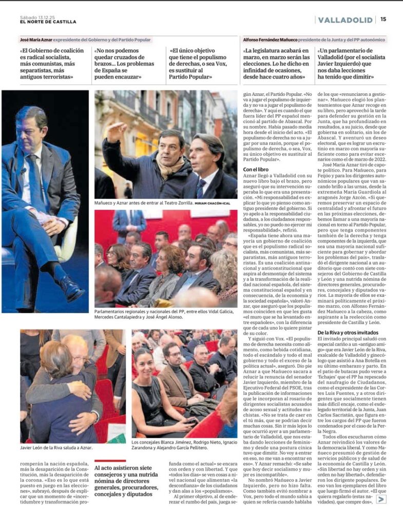 El acto ha contado con la asistencia de numerosos cargos institucionales y orgánicos del Partido Popular en Castilla y León, así como representantes del ámbito social y económico. La presentación ha concluido con la firma de ejemplares de Orden y Libertad y con un mensaje final de Aznar en defensa de los valores liberales: “La libertad no es débil, es frágil. Tiene que ser defendida y por tanto nuestra responsabilidad es muy grande… La confianza que yo tengo es el poder de la libertad”.